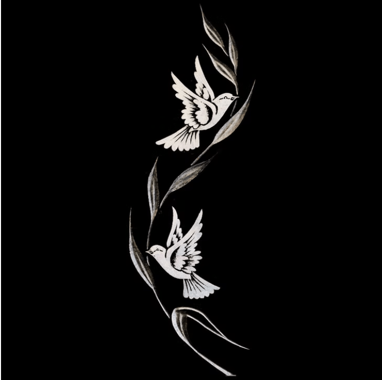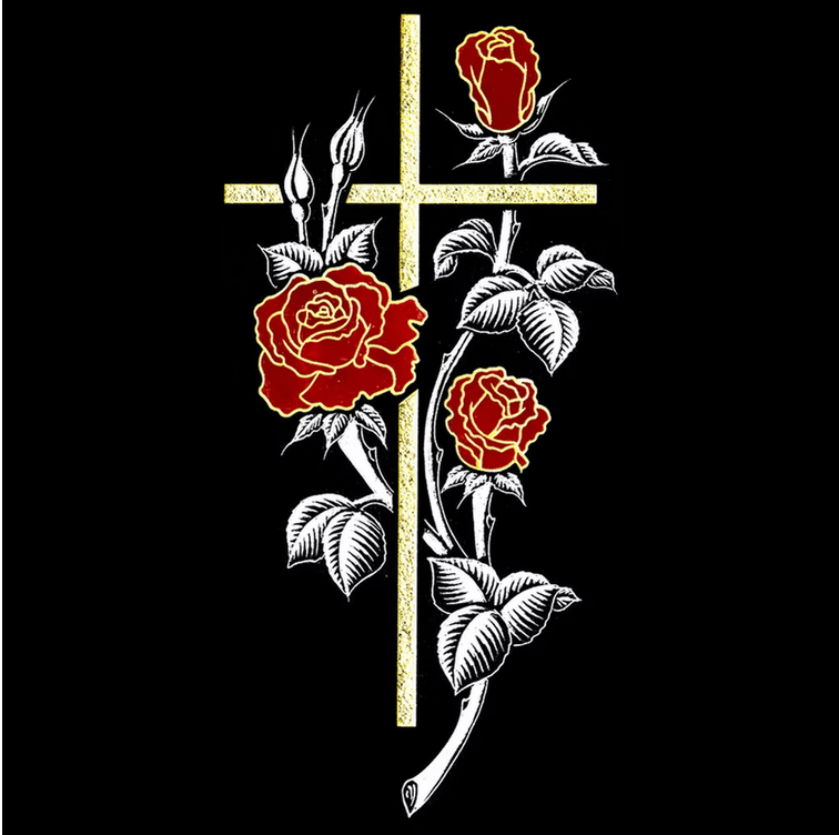 Pour accompagner le texte de la gravure sur pierre tombale, les marbriers funéraires proposent une large gamme de motifs. Les ornements peuvent être religieux (croix, étoile de David, croissant) ou laïques (fleurs, colombes, blés, instruments de musique). La lithogravure permet même de reproduire des paysages ou des portraits sur le granit noir avec une grande précision.